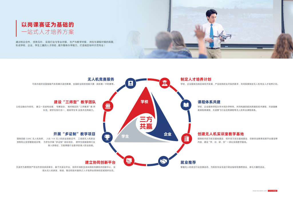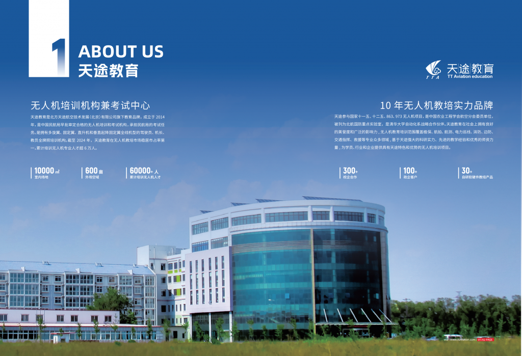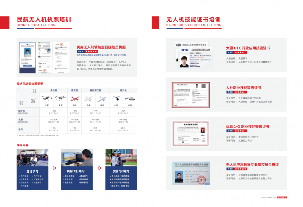 同时,天途是民航局无人机执照与中国民航飞行员协会(ChALPA) 地区考试中心,是国内少数拥有大中小型机全牌照培训机构,也是大疆金牌合作伙伴,可颁发多旋翼、固定翼、直升机、垂起固定翼等全线无人机机型的驾驶员、机长、教员执照、人社和UTC 无人机证书。