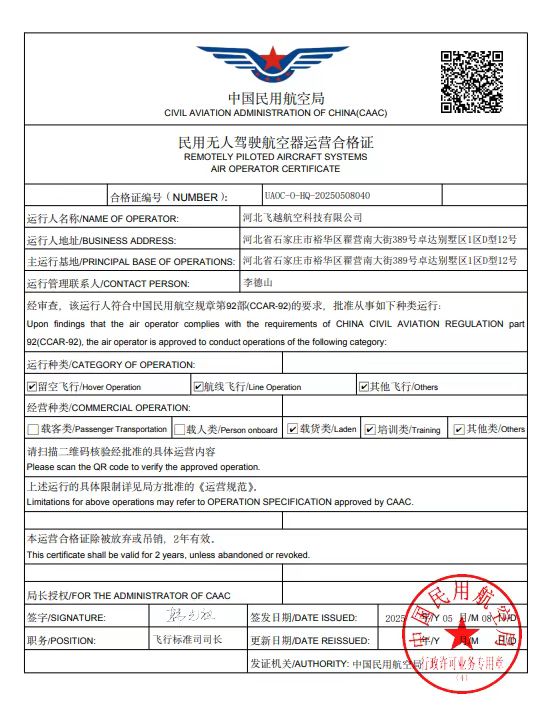 (三)权威资质认证服务 作为官方认可的无人机资质培训与考试合作机构,公司为学员提供 “培训 + 考试 + 认证” 一站式服务,助力学员获取行业认可的权威证书: 涵盖中国民航局无人机驾驶员执照(视距内 / 超视距)、AOPA 无人机驾驶员证书等核心资质; 配备专业的考前辅导团队,通过模拟考试、考点解析等方式,提升学员考试通过率; 协助学员完成证书申请、审核与领取的全流程,节省时间成本。