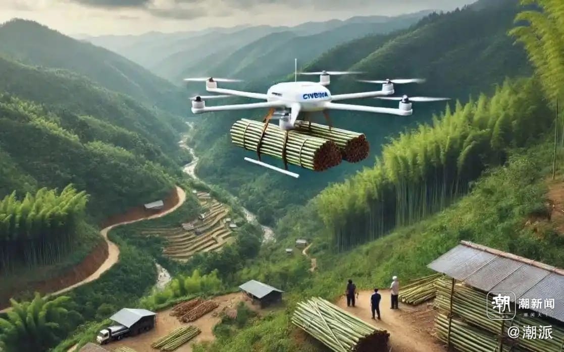 “嗡嗡嗡……”近日,在遂昌县城周边的竹林里,随着无人机的旋翼声响起,一台无人机腾飞而起,其下方吊着两根毛竹,穿过山林后直接将毛竹精准运送至公路边,短短5分钟就完成了一趟运输工作。