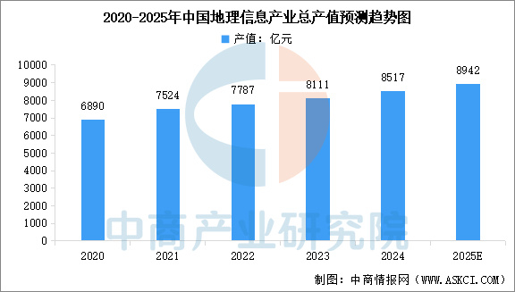 近年来,我国地理信息产业规模持续扩大。中商产业研究院发布的《2025-2030年中国地理信息系统(GIS)深度分析及发展前景研究预测报告》显示,2023年我国地理信息产业总产值达到8111亿元,同比增长4.2%,初步形成了完整的地理信息产业链。中商产业研究院分析师预测,2025年中国地理信息产业总产值将达到8942亿元。