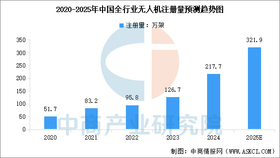 受益于行业发展及政策支持,近年来中国无人机注册数量快速增加。中商产业研究院发布的《2025-2030中国民用无人机行业市场研究及前景预测报告》显示,截至2024年底,全行业注册无人机共217.7万架,较2023年增长71.8%。中商产业研究院分析师预测,2025年中国全行业无人机注册量将超过300万架。