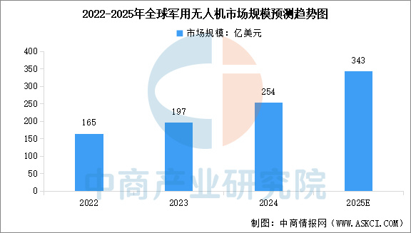 军用无人机作为现代战争中的关键装备,凭借其隐蔽性强、效费比高、无人员伤亡风险等优势,已成为各国军事力量发展的重要方向,全球军用无人机市场规模高速增长。中商产业研究院发布的《2025-2030全球军用无人机行业市场研究及前景预测报告》显示,2024年全球军用无人机市场规模约254亿美元,较上年增长28.9%。中商产业研究院分析师预测,2025年全球军用无人机市场规模将达到343亿美元。