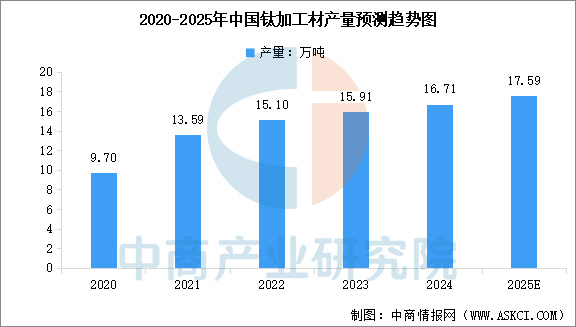 受航空等领域需求复苏的影响,中国钛加工材产量继续保持平稳增长态势。中商产业研究院发布的《2025-2030年中国钛材产业前景预测与战略投资机会洞察报告》显示,2023年我国共生产钛加工材15.91万吨,同比增长5.3%。其中,半成品材产量为3.15万吨,成品材产量为12.75万吨。中商产业研究院分析师预测,2025年中国钛材产量将达到17.59万吨。