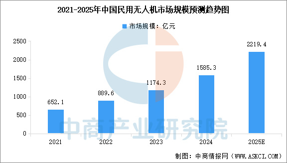 近年来,我国无人机民用化进程加快,民用无人机产业快速发展。中商产业研究院发布的《2025-2030中国民用无人机行业市场研究及前景预测报告》显示,2023年中国民用无人机产业规模达到1174.3亿元,同比增长32%,2024年中国民用无人机市场规模约1585.3亿元。中商产业研究院分析师预测,2025年中国民用无人机市场规模将达到2219.4亿元。