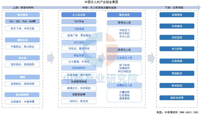 无人机产业链上游为无人机设计研发及原材料供应,原材料主要包括镁铝合金、钛合金、钢材、复合材料等;中游为无人机系统及无人机整机组装,包括军用无人机和民用无人机,民用无人机又包括消费级无人机和工业级无人机;下游为应用领域,包括地理测绘、农林植保、安防监控、电力巡检、应急救援、物流配送、影视航拍等。