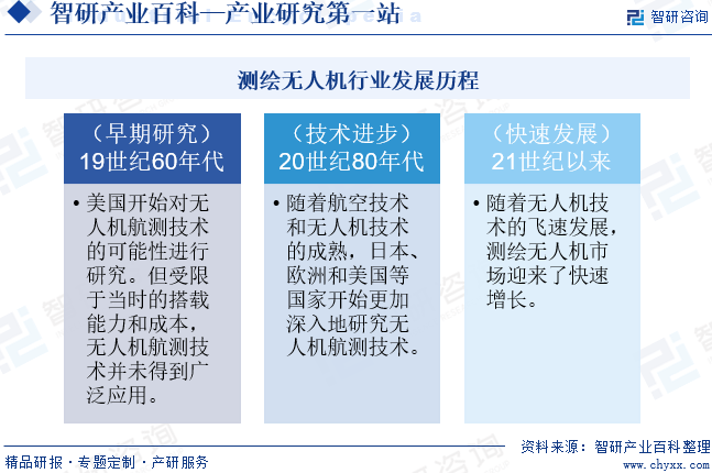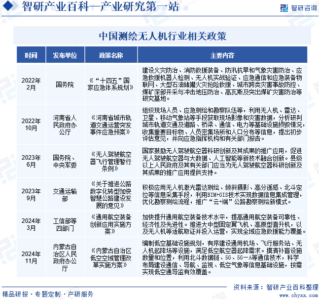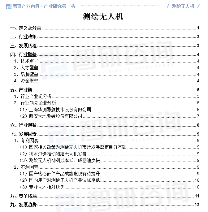 智研产业百科是智研咨询推出的产研工具平台,致力于为您提供全方位的百科式产业信息查询服务。智研咨询践行用信息驱动产业发展的企业使命,完善和丰富企业方法论,依托产业百科平台提升信息价值,持续为行业发展及企业投资决策赋能。测绘无人机产业百科作为测绘无人机产业一站式系统化研究工具,全面归纳了测绘无人机产业知识信息,内容涵盖测绘无人机产业的定义、分类、政策、产业链、竞争格局、发展趋势等,并依靠信息技术建立智能互链的行业知识图谱,为行研从业者及相关投资者提供深入的洞察力和全面的信息。