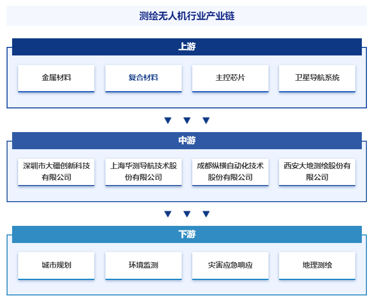 测绘无人机行业产业链是一个涵盖从原材料供应、无人机制造到应用领域等多个环节的完整生态系统。产业链上游主要是原材料供应和关键零部件制造,主要包括金属材料、复合材料、主控芯片、卫星导航系统等。产业链中游为测绘无人机制造。产业链下游为测绘无人机的应用,包括城市规划、环境监测、灾害应急响应、地理测绘等。