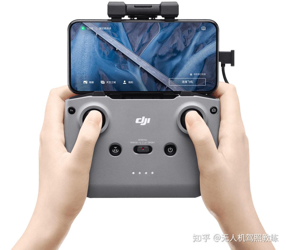 双手正确握持遥控器是开始飞行的第一步,你需要将拇指按压在摇杆上方,并在飞行过程中不离开摇杆。食指放在遥控器上方按键与拨轮处,其余手指在遥控器背面用力握持。